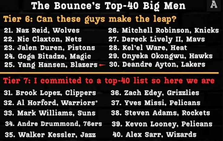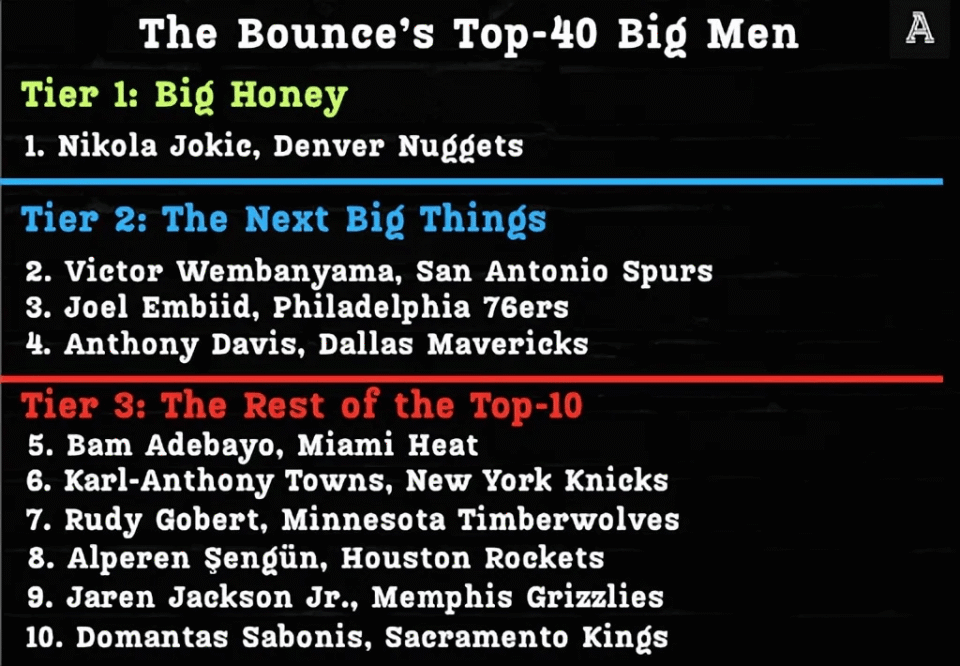 美媒《TA》专家Harper公布了新赛季40大中锋的排名,前十分别是约基奇、文班亚马、恩比德、浓眉哥、阿德巴约、唐斯、戈贝尔、申京、小贾伦-杰克逊和萨博尼斯。