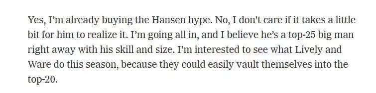 Harper对此表示:“我已经开始相信杨瀚森的潜力,凭借他的技术和身材,就敢断定其一上来就能跻身至前25名大个子之列。”