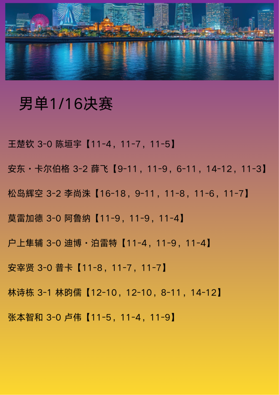 北京时间8月7日晚,2025年WTT横滨冠军赛,男单1/16决赛激战完8场。至此,本届男单16强已定8席,国乒选手林诗栋、王楚钦晋级,陈垣宇、薛飞双双一轮游。此外,张本智和、莫雷加德、松岛辉空、安宰贤、安东·卡尔伯格、户上隼辅也都取得晋级。